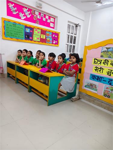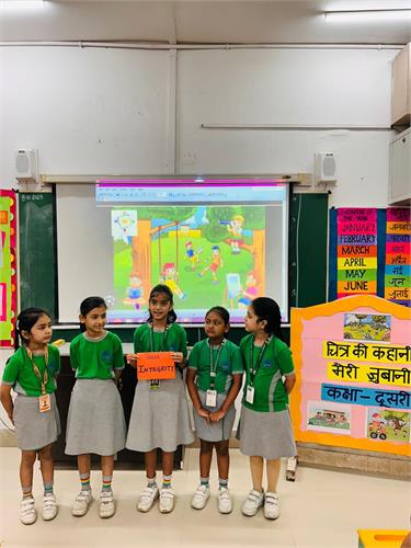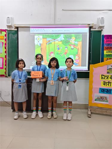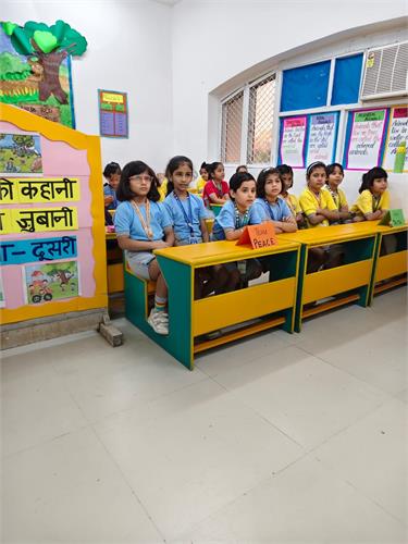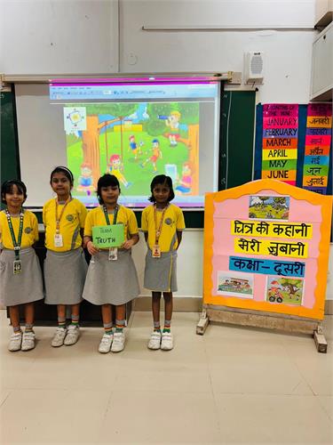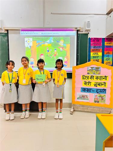 कक्षा 2 के विद्यार्थियों हेतु “र्ित्र की कहानी मेरी जुबानी” प्रततयोर्िता का सफल आयोजन २६-९-२०२५ को ककया िया|इस प्रततयोर्िता के अंतिित प्रत्येक सहभािी छात्र को एक र्ित्र प्रदान ककया िया, जजस पर आधाररत मौललक ि उद्देश्यपूर्ि कहानी प्रस्तुत करने हेतु 2 से 3 लमनट का समय ददया िया| विद्यार्थियों ने अत्यंत उत्साह के साथ भाि लेते हुए अपने वििारों ि शब्दों के माध्यम से र्ित्रों को जीिंत रूप प्रदान ककया|तनर्ियन के मानदंडों में रिनात्मकता, अलभव्यजतत, भाषर् शैली, कहानी की संितत ि आत्मविश्िास को प्रमुखता दी िई| सभी विद्यार्थियों ने पूरे आत्मविश्िास के साथ प्रदशिन कर अपनी क्षमताओं का उत्कृष्ट पररिय ददया| विद्यालय प्रशासन ने प्रततभािी विद्यार्थियों के उत्साह की सराहना की तथा आिे भी ऐसे निािारात्मक कायिक्रम आयोजजत करने की प्रततबद्धता व्यतत की| इस प्रततयोर्िता ने नन्हे विद्यार्थियों को अपने वििारों को खुलकर व्यतत करने और आत्मविश्िास के साथ प्रस्तुत होने का अद्भुत अिसर प्रदान ककया |
