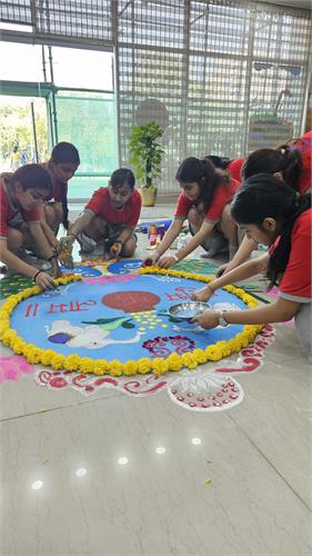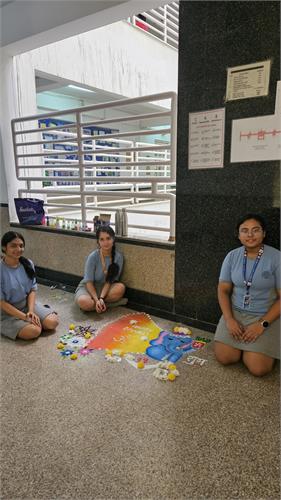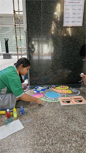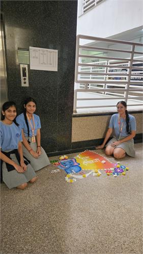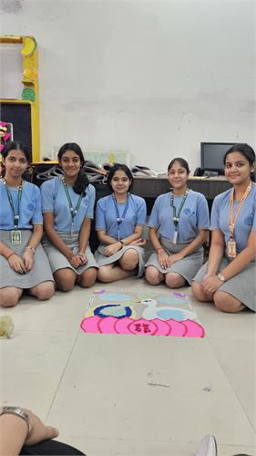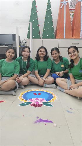 The theme of the competition, “Diwali – The Festival of Lights,” inspired participants to create artistic designs symbolizing the triumph of light over darkness. Students used natural and sustainable materials such as coloured powders, flower petals, diyas, and mirrors to create intricate and vibrant patterns. Each house displayed exceptional talent and originality in their designs, reflecting the beauty and diversity of Indian art forms.