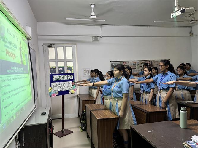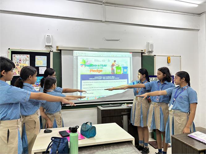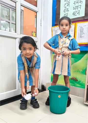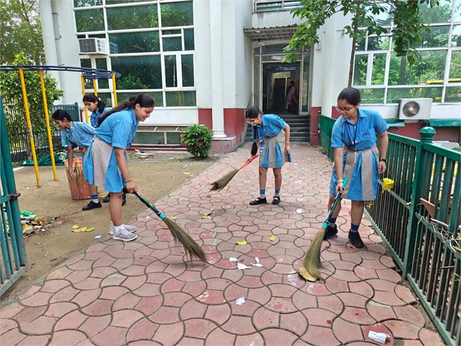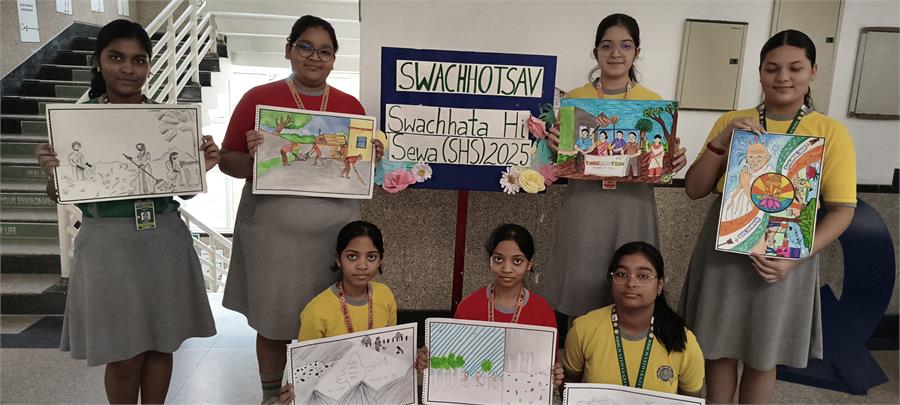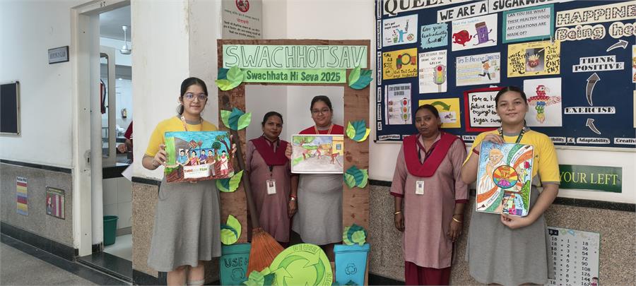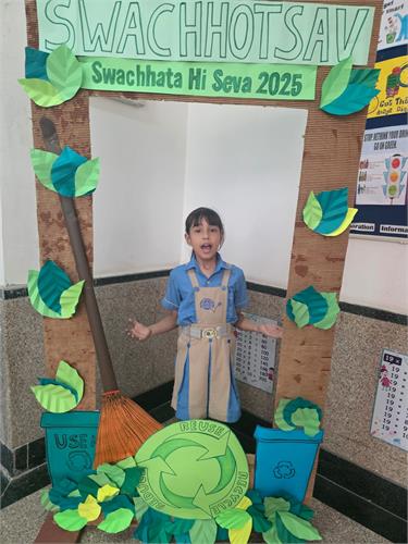 Across other grades, Classes I and II took part in plantation drives using recycled bottles and learned the importance of waste segregation. Classes III–V cleaned their classrooms using dusters, and students of Classes IV and V also presented a spirited poem recitation on the theme of cleanliness, spreading awareness through rhyme and expression. Classes VI–VIII stepped out with banners for a cleanliness drive to spread community awareness. Senior students of Classes IX and X undertook garden cleaning and cleaning of school areas, while Class IX & XI also showcased posters and paintings. A colourful Selfie Point added cheer, symbolising pride in a cleaner and greener tomorrow. Together, these activities strengthened environmental stewardship and highlighted the school’s commitment to a cleaner, healthier campus and neighbourhood.